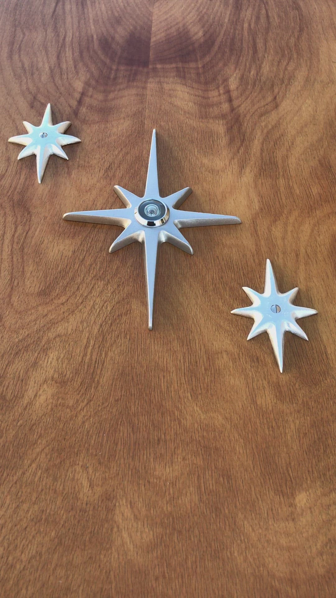 Introducing our remarkable Atomic Starburst Door Trio, a stunning ensemble designed to infuse your home with a touch of mid-century splendor. This trio features a magnificent center Starburst measuring 7 1/2 inches tall by 5 1/4 inches wide, accompanied by two smaller starbursts measuring 3 3/4 inches tall by 2 1/2 inches wide each. Meticulously crafted and clear coated, these starbursts boast a timeless shine that will captivate any vintage enthusiast.